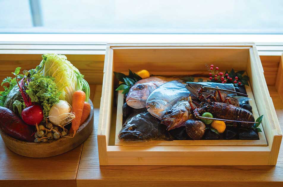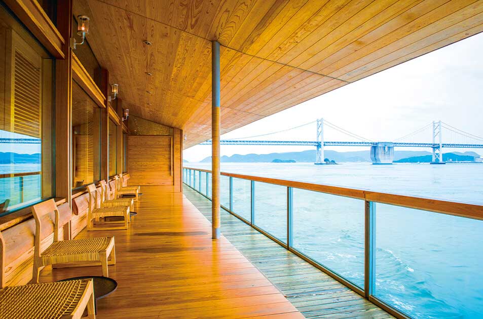 Relax on board this ship, which resembles a Japanese ryokan and blends into the gentle landscape of Setouchi, filled with special pleasures, including a dining experience of 'what you want, as much as you want,' a cozy six-seat sushi bar with a view of the sea, Japanese confectionery at the Lounge, and communal baths with hinoki cypress bathtubs and saunas.