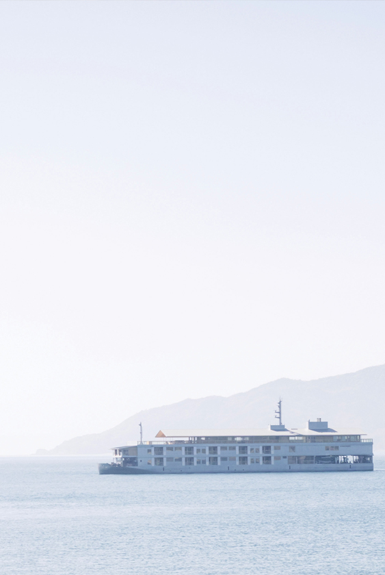 Board the guntû, a unique hotel floating on the Seto Inland Sea, modeled after a traditional Japanese luxury ryokan.