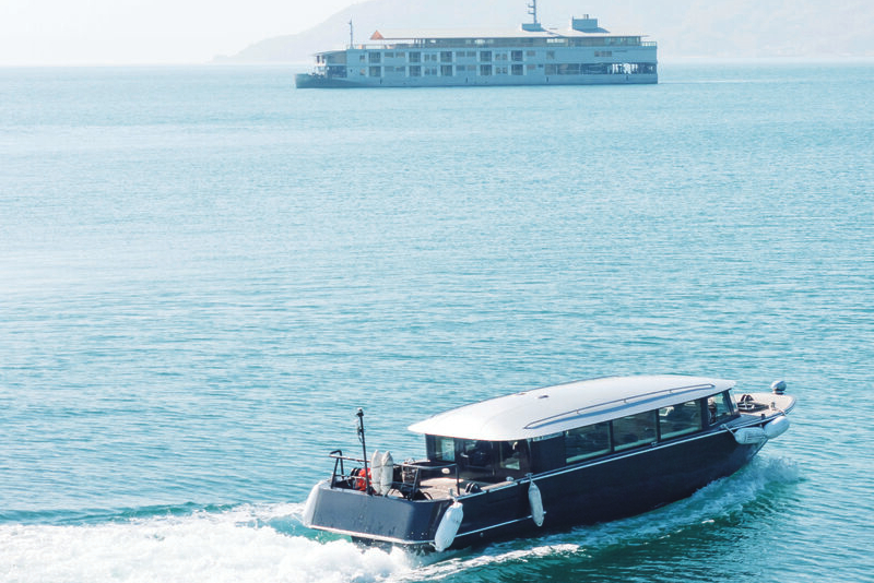 屋根瓦のある瀬戸内の風景に溶け込むように設置された切妻の屋根と、海の色にあわせて変化するシルバーの船体が特徴です。