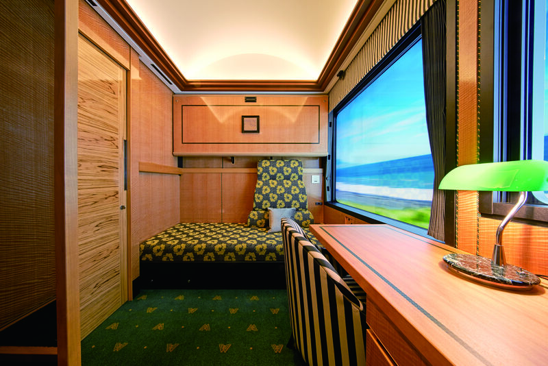 中国地方の5県の木材を用いたドアや沿線の伝統工芸品をあつらえました。また、収納式のベッドにより、昼間は広いリビングスペースでゆったりお過ごしいただけます。(※1)客室にいながら列車の左右両側を眺望できるレイアウト(※2)と、大きな窓により車窓をお楽しみいただけます。さらに、開閉できる窓からは沿線の風を感じることができます。(※1)ロイヤルツインのみ (※2)ユニバーサル対応の客室を除く。