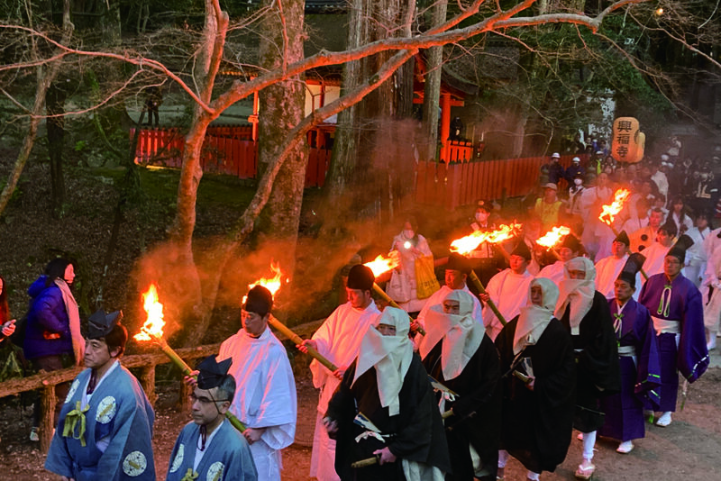 春日大社での御本殿特別参拝後、聖火行列と御神火を松明に点火する神事の様子を拝観します。