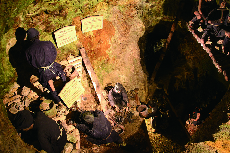 江戸初期に開削された坑道跡に「佐渡金山絵巻」に描かれた採掘作業を再現しています。