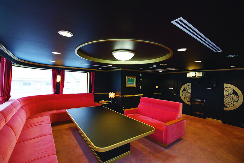 ●金色に変身したふじさん駿河湾フェリーでは、3階特別室を貸し切り、特別プランのお食事を愉しみます。