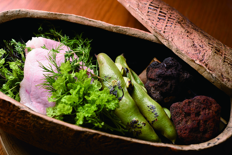 <ご夕食> 地産の季節の食材を薪と炎と溶岩石を使って仕上げた日本料理
