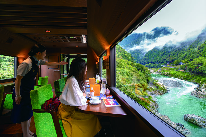「四国まんなか千年ものがたり」は、吉野川沿いに右に左に渓谷を臨みながら、ゆっくり進みます。徒歩でしか行けない秘境「坪尻駅」ではスイッチバックを体験いただけます。輝く伊予灘を眺めながら進む「伊予灘ものがたり」は、美しい海岸線沿いをゆっくり進む人気観光列車です。