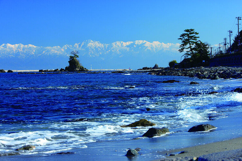 海越しの女岩と立山連峰はまさに絶景スポットのひとつ。海を挟み標高3,000m級の山々を望むことができる景色は世界でも珍しい景勝地です。
