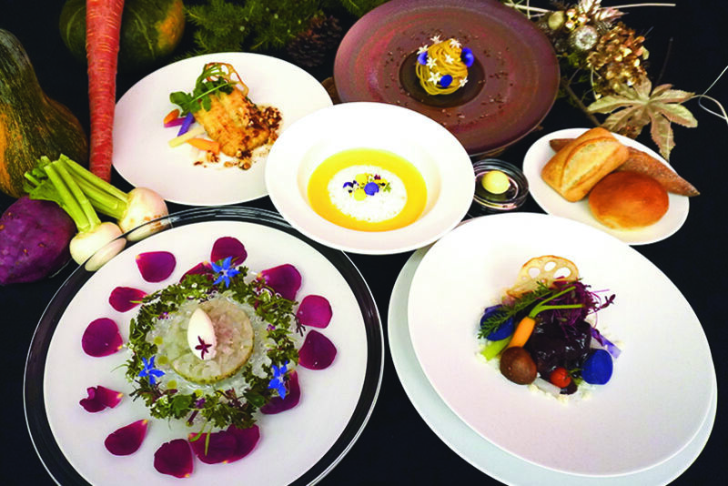 瀬戸内海を一望できる場所に建つレストラン。ホテルオークラ東京「ヌーヴェル・エポック」の料理長も務めた高橋哲治郎氏が監修。小豆島オリーブ牛や瀬戸内海の魚介類など地元の食材を活かした至極のお料理について高橋氏が説明も行います。