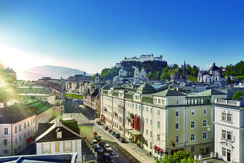 ザルツァッハ川のほとりに建つ白亜の外観が美しいホテル。このホテルの歴史は長く、かつて 「オーストリアの宮廷」という名で親しまれていたグランドホテルを、本家のホテル ザッハー ウィーンを所有するギャルトラー家が買収し、今では街のランドマークとして君臨しています。また、毎年夏に開催される「ザルツブルク音楽祭」 に参加する著名人が集う、社交界の中心的ホテルとしても知られています。