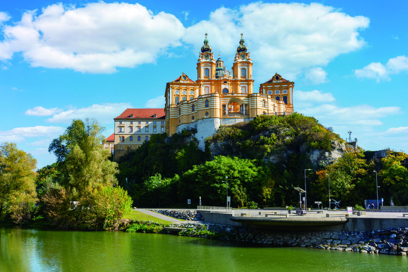 バッハウ渓谷に建つメルク修道院はオーストリア屈指のバロック建築で、東西320mの修道院が65mの尖塔を
