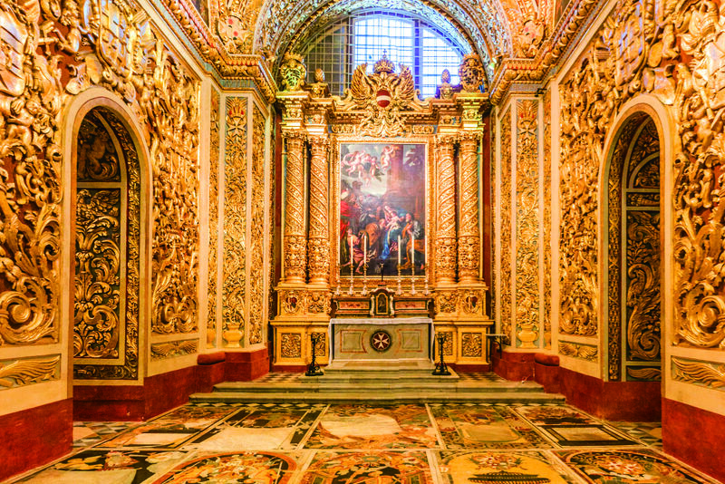 聖ヨハネ騎士団によって建てられた大聖堂。床一面には400にも及ぶ騎士団員たちの墓碑が敷き詰められています。