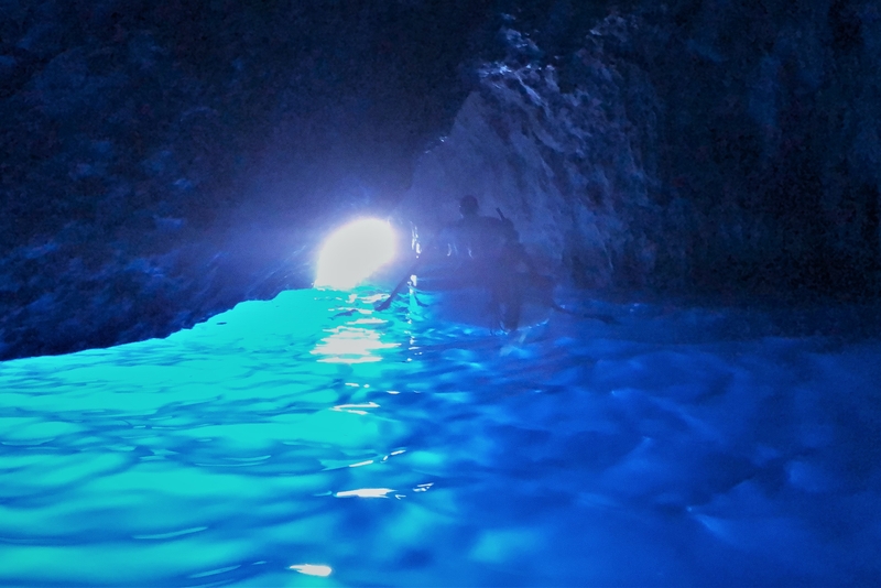 外の光が屈折して洞窟内を青く染める神秘的な洞窟。入り口は1mほどの高さで、晴れていても、波が高いと入れない希少な観光スポットです。
