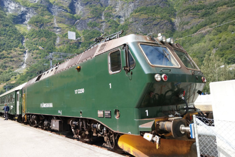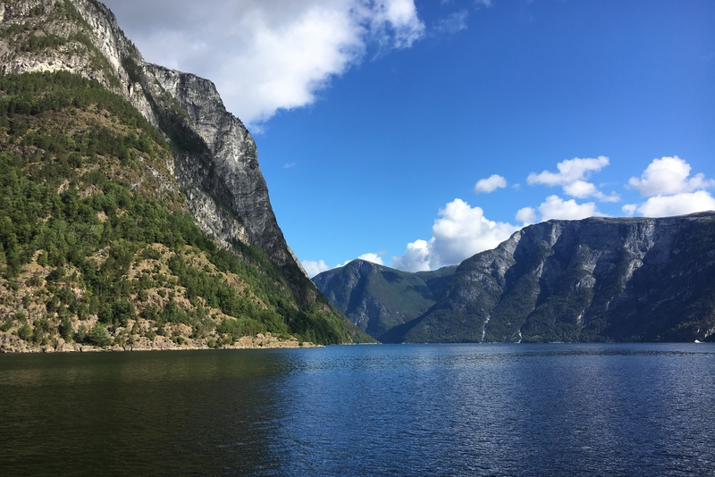 ネーロイフィヨルド(車窓)とアウランフィヨルド(車窓)の遊覧クルーズ、景勝ルート・フロム山岳鉄道とベルゲン鉄道に乗車してフィヨルド地方へご案内 途中、落差93mのショスの滝(下車)へも立ち寄り