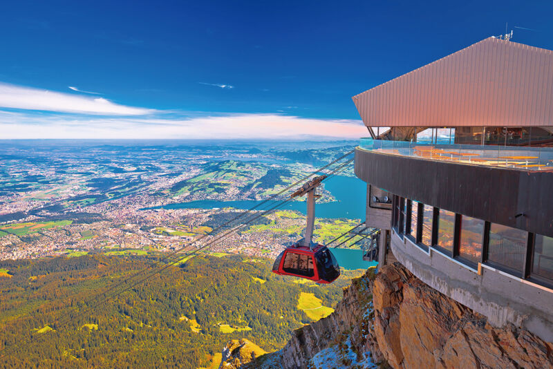 標高2,100m。眼下の湖など大パノラマを望む山では、世界一急勾配の歯車式登山電車とゴンドラに乗車。