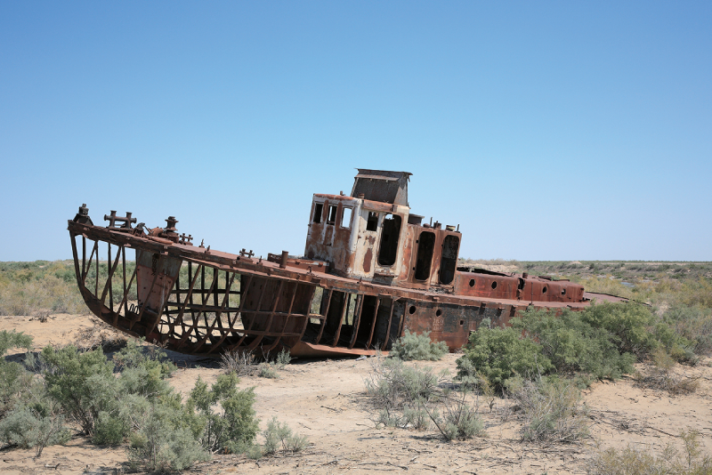 1日 アラル海のかつての港町ムイナクへ。着後、干上がったアラル海と船の残骸がならぶ船の墓場を訪れます。