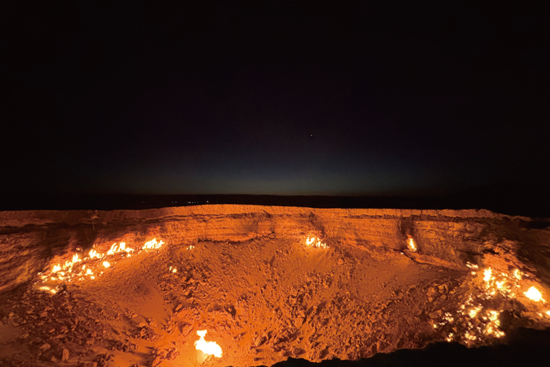 荒涼とした大地にポッカリ口をあけ、燃え続けるガスクレーター「地獄の門」。炎の勢いが弱くなりつつあるとはいえ、まだまだ迫力があります。