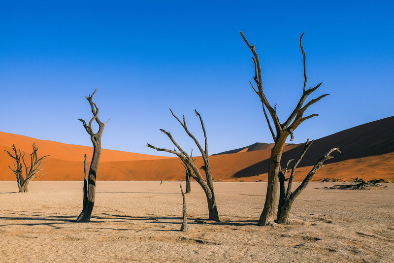 夜明けとともに公園のゲートが開門、一斉に砂丘を目指します。公園の深部にある立ち枯れで有名なデッドフレイ。4WDを降りどうしても徒歩で向かっていただく必要がありますが、小さな砂丘を超えてたどり着いた先に広がる荒涼とした光景は何にも代えがたいものがあります。