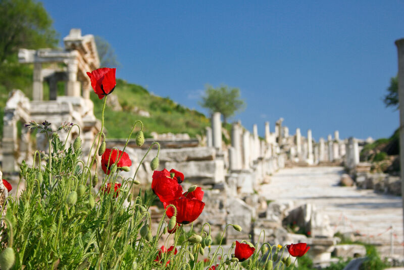 6月頃になると遺跡の石畳の隙間や周辺の草地に様々な野花が顔を出します。特に印象的なのが赤いポピーです。遺跡の白い大理石との赤のコントラストが美しく映えます。