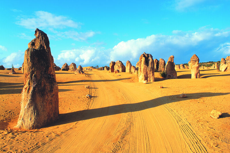 青い空と広大な黄色の砂漠のコントラスト、数百万年の時を経て形成された奇岩群のシルエットが素晴らしく、非日常的な風景が広がります。オーストラリアを代表する絶景ポイントです。